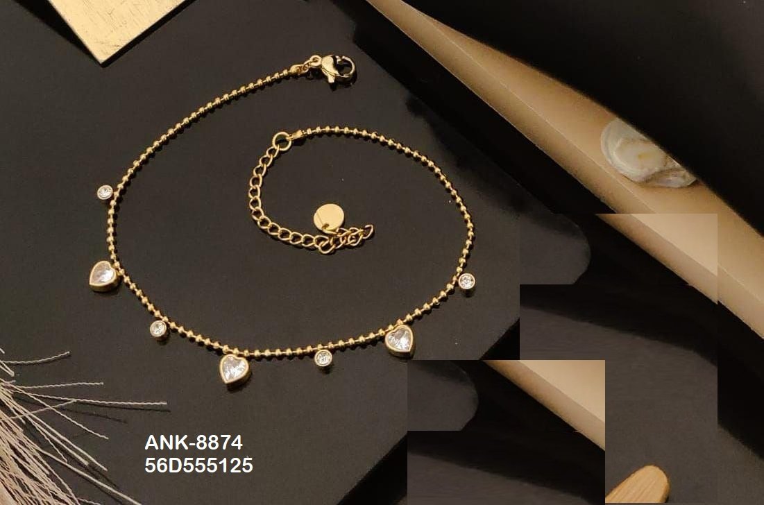 Buy anti tarnish stainless steel anklets wholesale from KIYUZIYU – ANJNI CREATION, Surat. Gold & Rose Gold plated adjustable American diamond Anklets. Waterproof, hypoallergenic. B2B bulk supplier. Global shipping available.